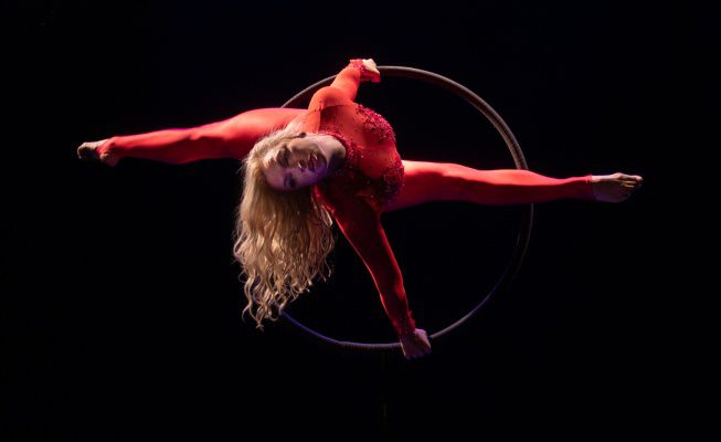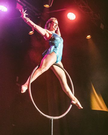 Ideal for indoor and outdoor venues, her lollipop lyra act brings the magic of aerial artistry to your event, all without the need for rigging