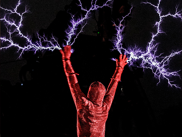 Harnessing over 4,000,000 volts of electricity, our performer deftly discharges lightning to the beat of the music in a truly electrifying display.