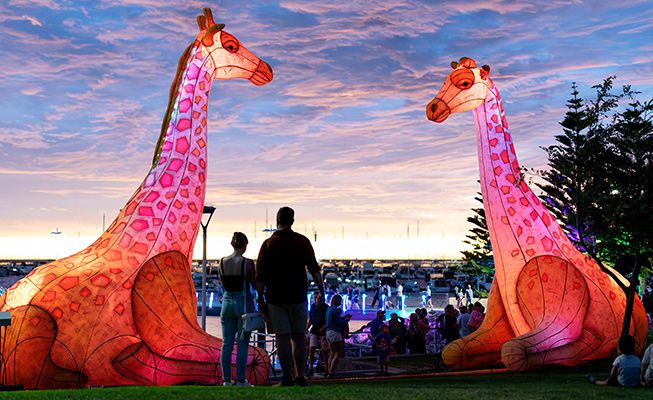 This elegant giraffe duo is made up of a pair of kneeling giraffes that tower six metres over guests. At night they are illuminated by LEDs