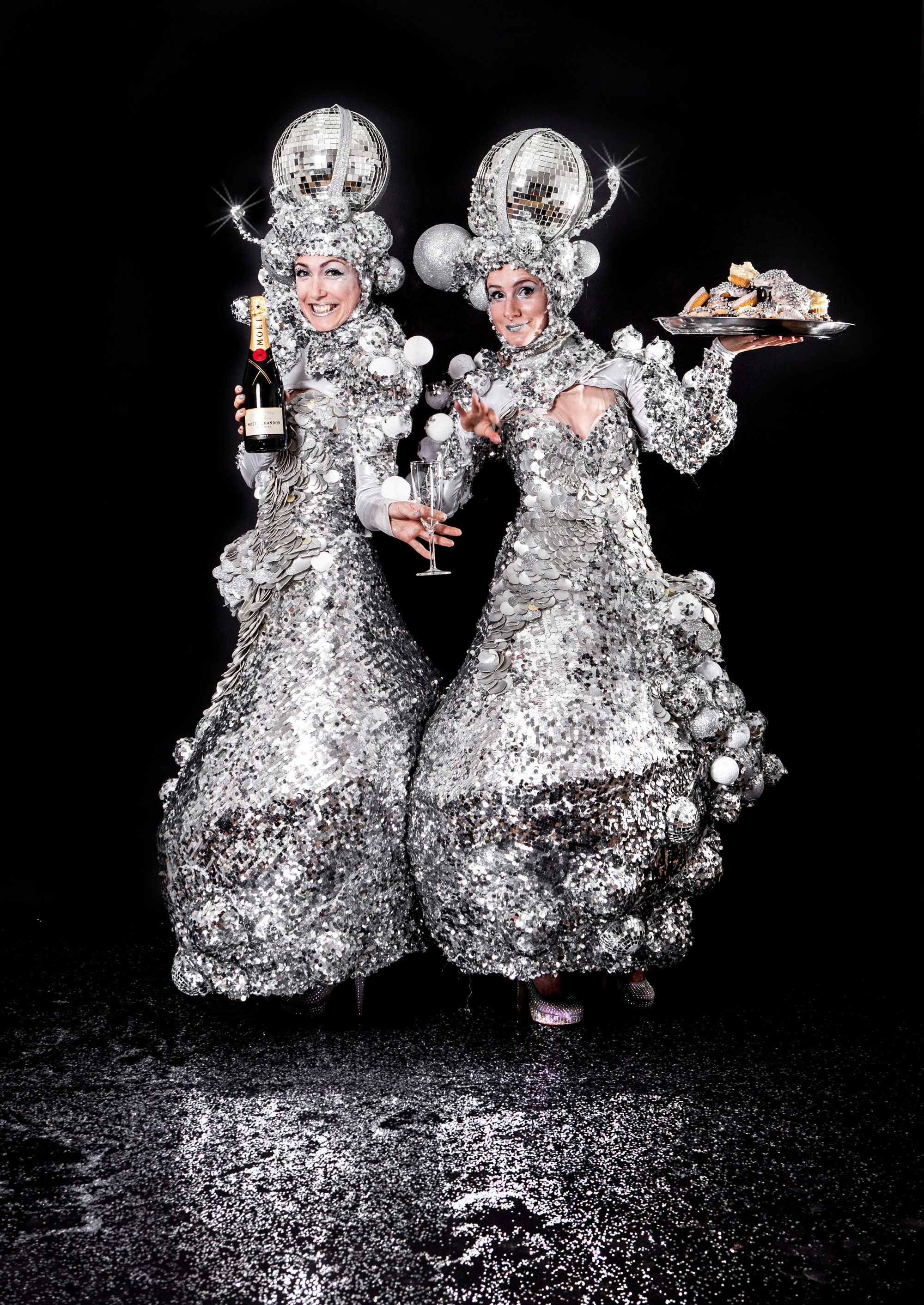 Available on stilts or on the ground they will dazzle guests as they walk about your event handing out drinks and canapés and provide fun entertainment as they rip up the dance floor stilts and all! Each costume features inbuilt light balls and LEDs which create shimmering mirror ball effect and give off an opulent glow perfect for a range of events; from wedding receptions and black tie balls, to street festivals and clubs nights.