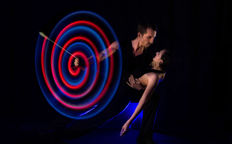 Accompanied by a tasteful selection of music ranging from ambient to Tango, the three artists present a mesmerising synergy of light and motion, using state-of-the-art LED props choreographed to the music down to the last detail.
