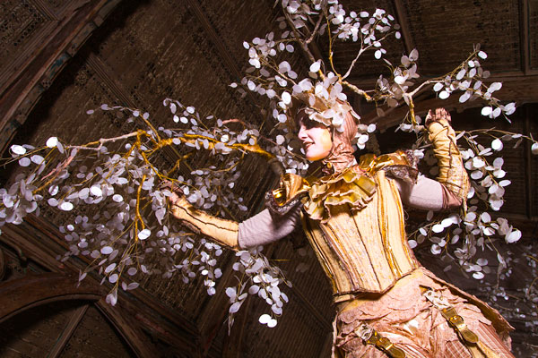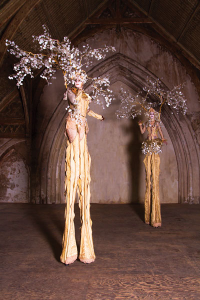 Their stunning golden costumes showcase elaborate and textured designs in the fabric on their bodices and that encase their 1.5 metre stilts. The overall look is completed with ostentatious headpieces that see golden branches adorned with shimmering white leaves soar high into the air. Our walkaround characters also boast beautiful make up in keeping with their costumes.