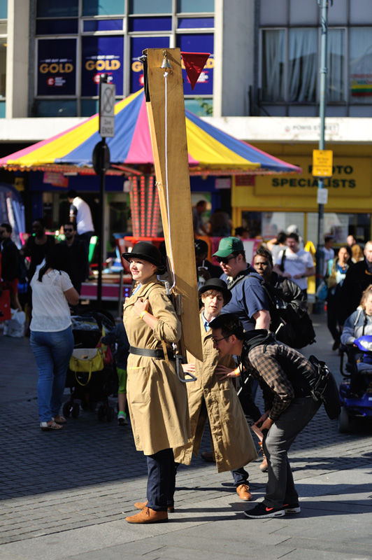 In costumes, the act seem like mad explorers trying to find somewhere new. With a giant, mounted periscope on the back of one, the other follows around, looking in and teaching people how to look in. As it’s a little difficult for observers to look through the periscope while it’s on the move, the pair regularly stop at points of interest for the kids (and adults!) to have a peep at the world around them.