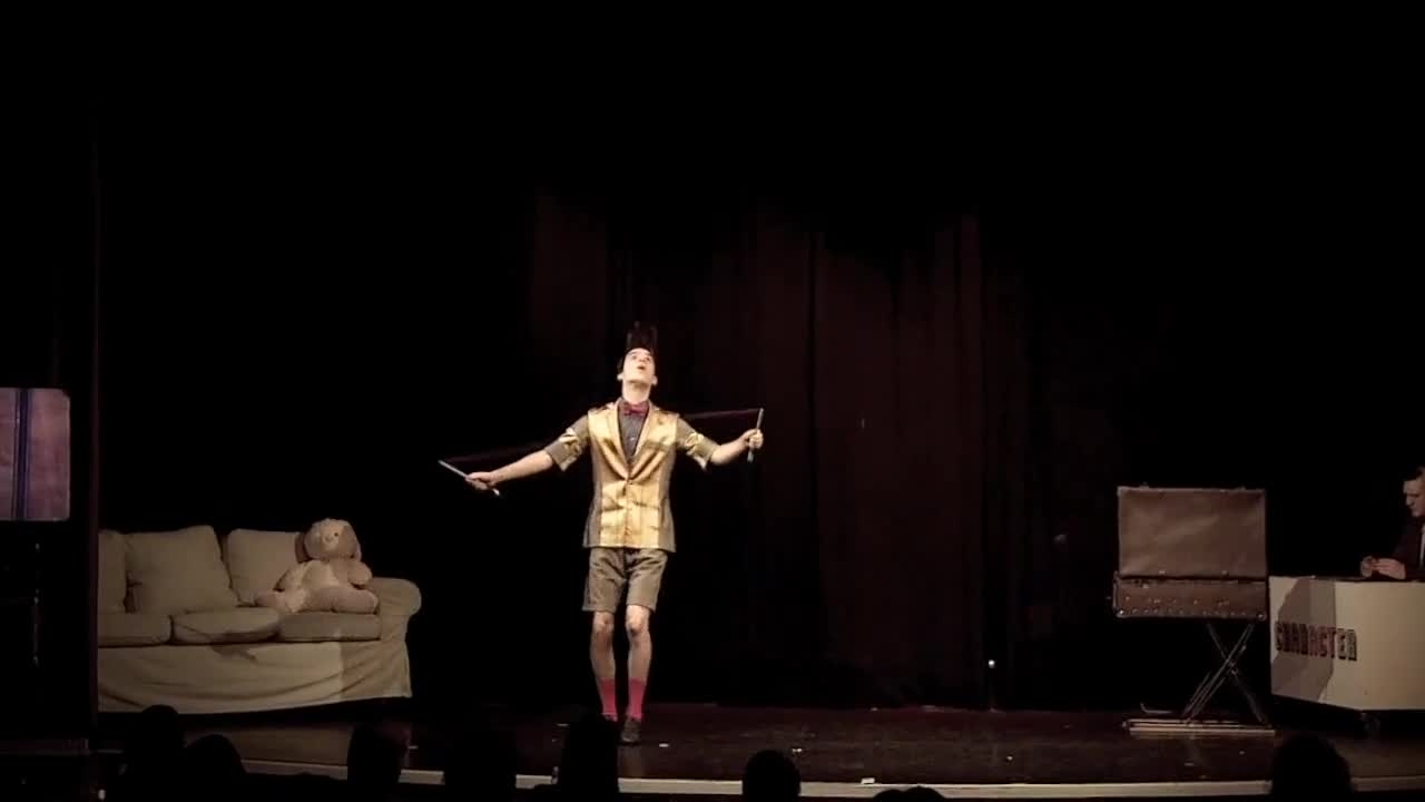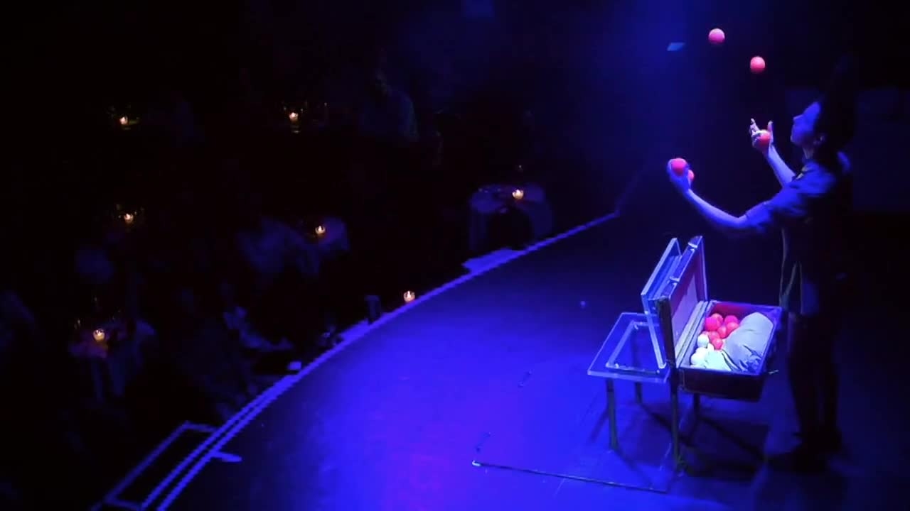 This comedy character appears on stage with a transparent swivel board and a suitcase filled with red bouncing balls. Audiences will watch on with confounded fascination as he juggles and bounces these balls with incredible speed and up to five at a time! Composed into a theatrical performance with a subtle storyline this is an engaging juggling act with heart.