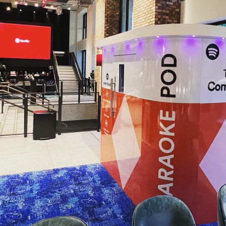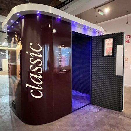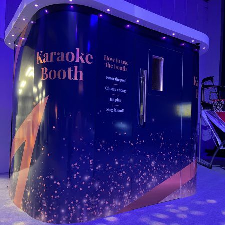 The karaoke booth can be fully branded to your needs, as seen previously for clients like Spotify, Sky, Magnum, Nestle, Virgin, O2 and Jet2 Holidays