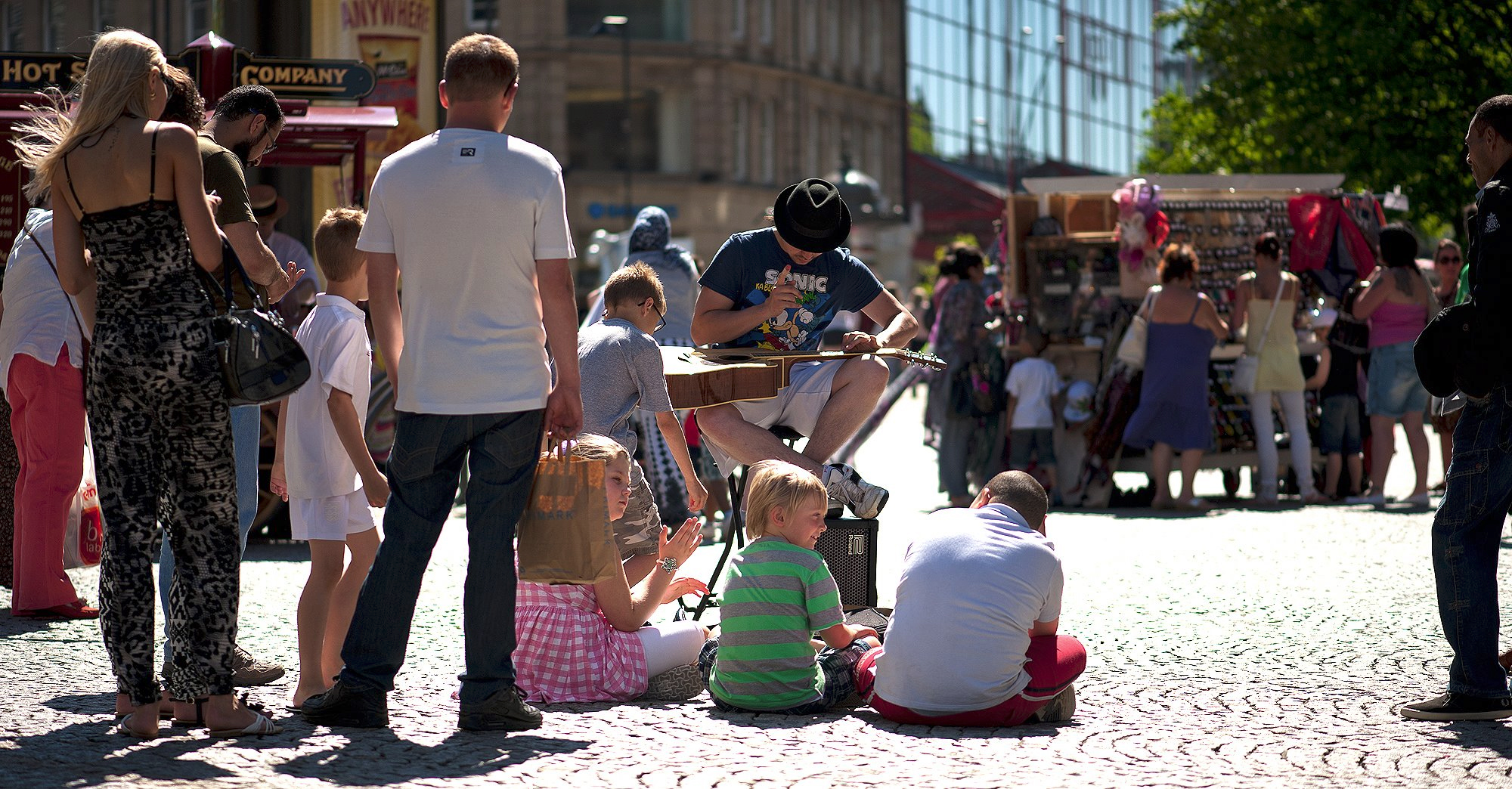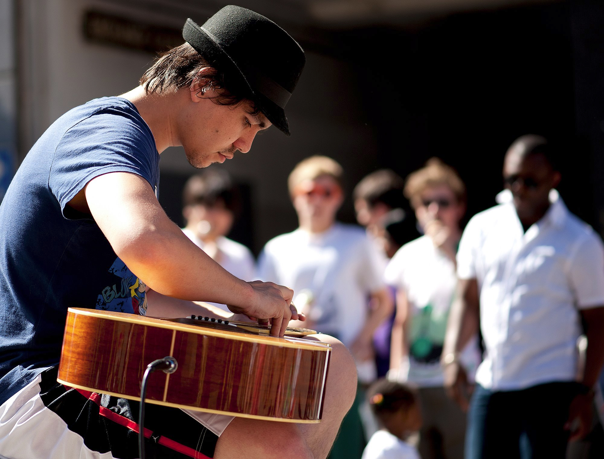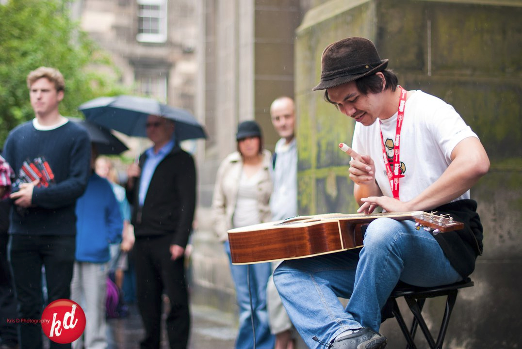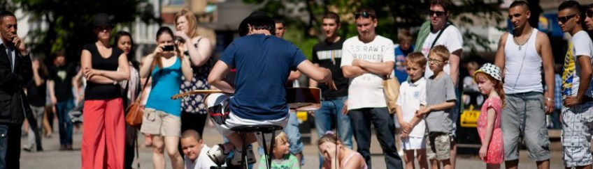 " Adam was a much loved feature of the Devizes International Street Festival in August this year. His extraordinary guitar style attracted large audiences! All power to those fingers! "