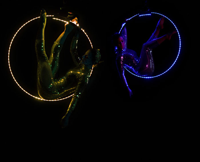 Both professionally trained acrobats, our aerial hoop artists have devised this act with high-end events in mind. Lighting up any venue with their sparkling illuminated costumes, the LED circus performers will have your guests mesmerised as they perform spectacular aerial gymnastics. A completely customisable glow act, the colour of our performers costumes and the colour of the LEDs can be set to accommodate your event’s colour scheme or theme. Also ideal for promotional events, our aerial performers’ costumes can be branded with your company logo to advertise a new product or campaign.