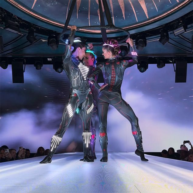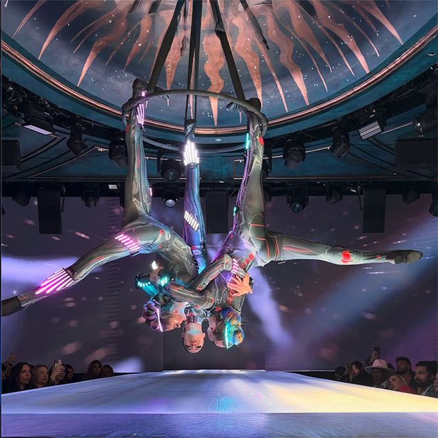 Dazzling illuminated costumes and synchronized movement create a breathtaking spectacle suspended high in the open air above guests