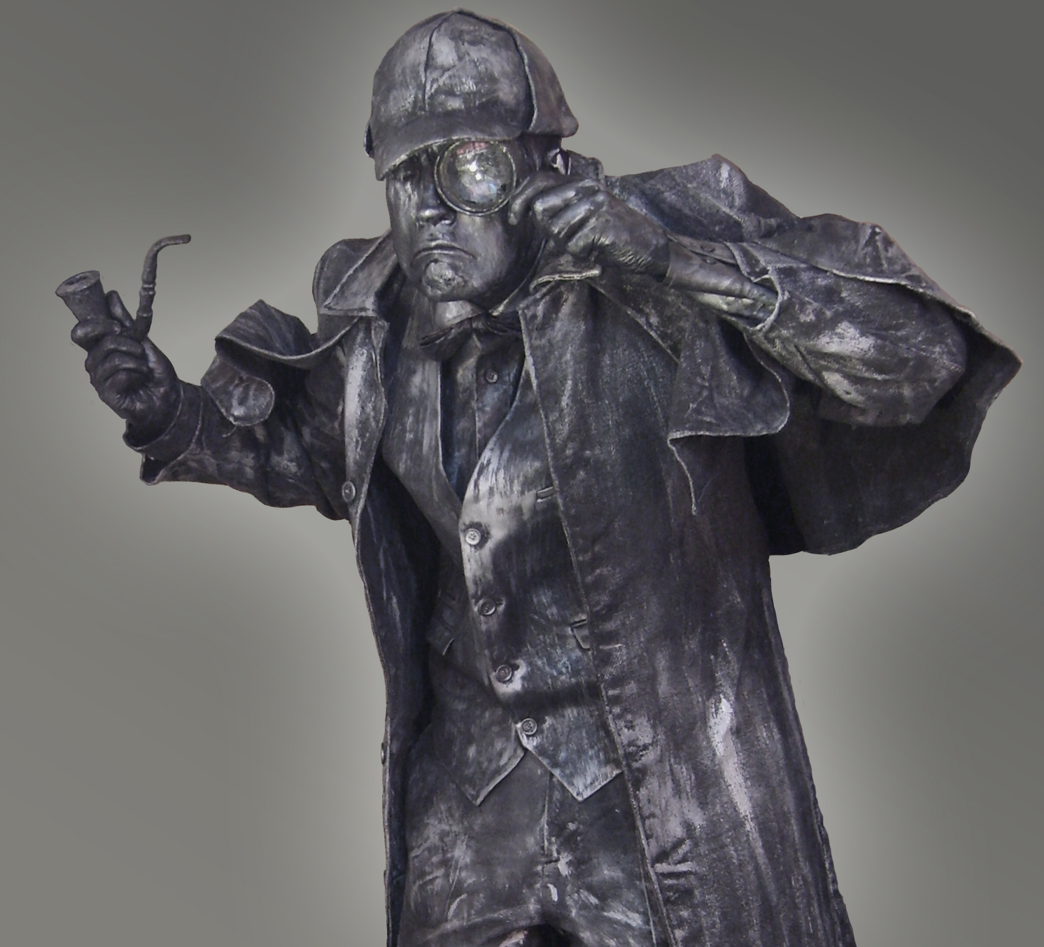 The great detective stands poised with his magnifying glass ready to search for clues on any unsuspecting guests that might pass his way. Made with a unique pewter silver style paint effect, this human statue is a wonderful character – truly in his element, he’s elementary dear Watson.