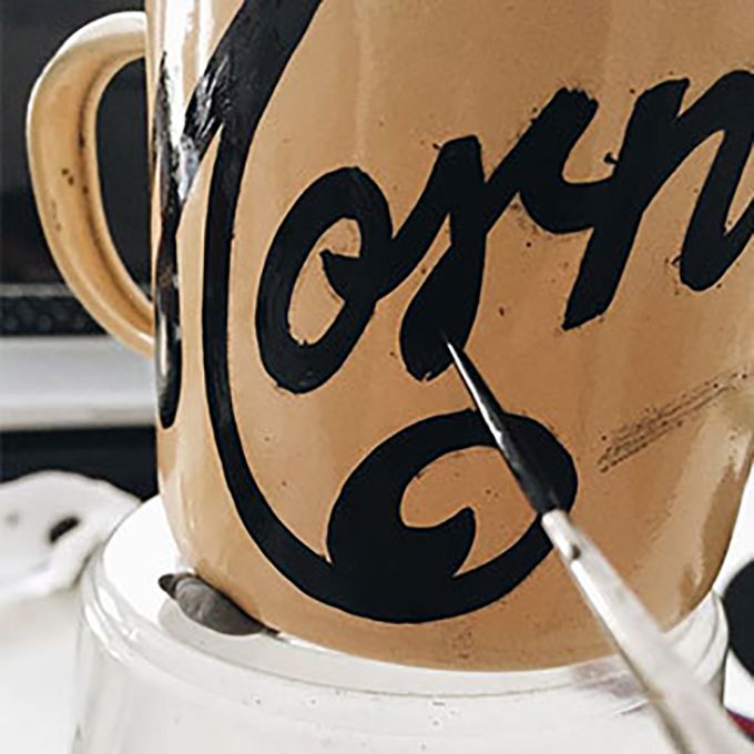 Calligraphy can be drawn onto paper as well as other objects such as mugs, keyrings, phone cases, and promotional products