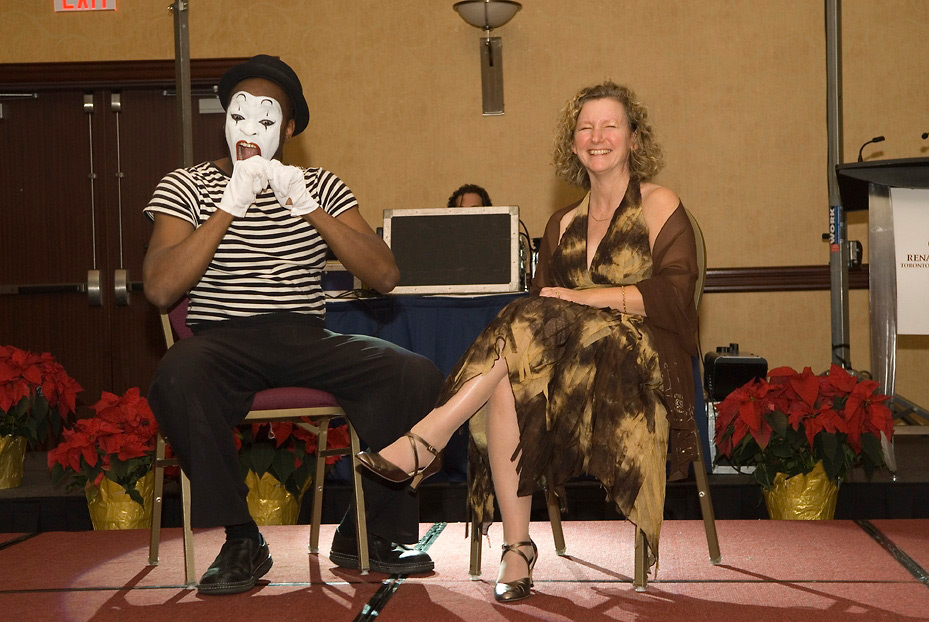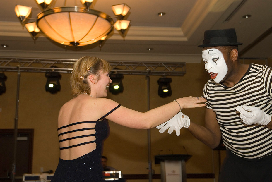 Why not have your guests sit back and be treated to a silent comedy show. The 15-30 minute shows consist of comedic skits set to music and audience members performing right on stage. The humour, improvisation and stunning mime illusion packed into this show make it a must see and will have your guests literally crying with laughter! A Mime Show with a twist! Etenem can also provide mime shows that are used in corporate presentations, speeches and seminars. Often attendees’ minds wander during these affairs, so using mime in unison with a presenter or performing a vignette of to do vs. not to do, engages the minds, stimulates the memory and definitely entertains all at the same time.