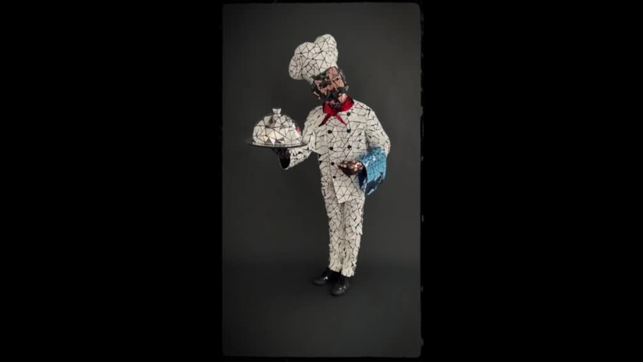 Dressed in a traditional inspired chefs outfit made from mirrors, our roaming character reflects ambient event lighting for a fun visual effect