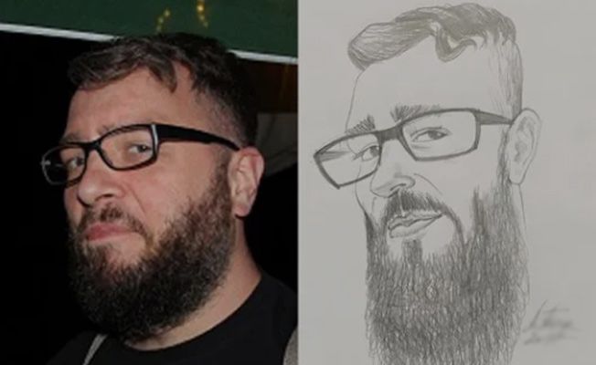 This artist creates quick guest portraits, playfully exaggerating distinctive features to capture both appearance and personality