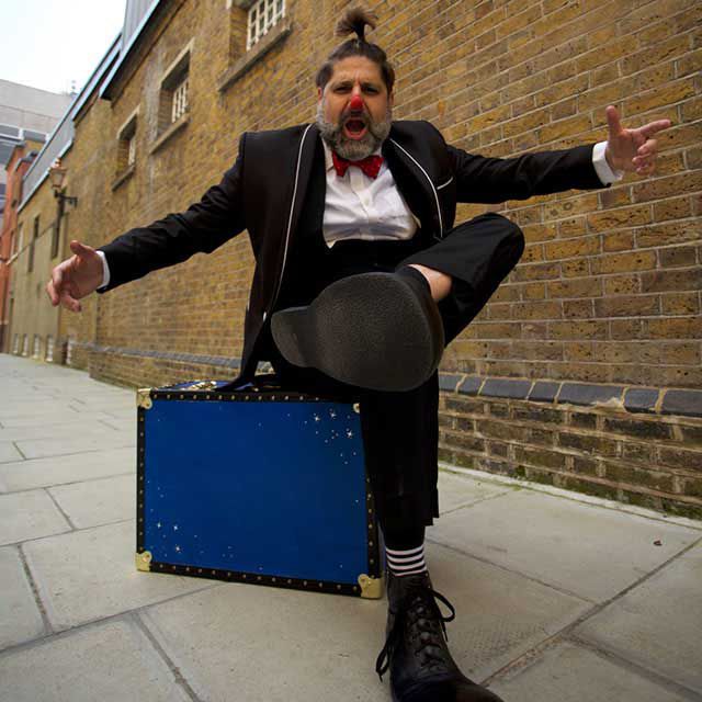 Our roaming comedy entertainer has been performing throughout London since 1987. Regularly appearing on the London Alternative and later the National Stand-Up Comedy circuit, headlining at all the popular comedy clubs in London and appearing at Jongleurs and The Comedy Store, just to name a couple. Since then he has performed at well-known theatres including; The National Theatre and the Theatre Royal, at many events, such as large scale festivals, including Glastonbury and Reading, resorts and amusement parks, as well as, throughout Europe, the USA, the Caribbean and the Far East.