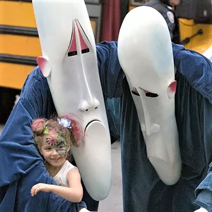 Their oversized white masks are full of mystery and intrigue as their large arms invite the audience in for a hug and a fun photo opportunity