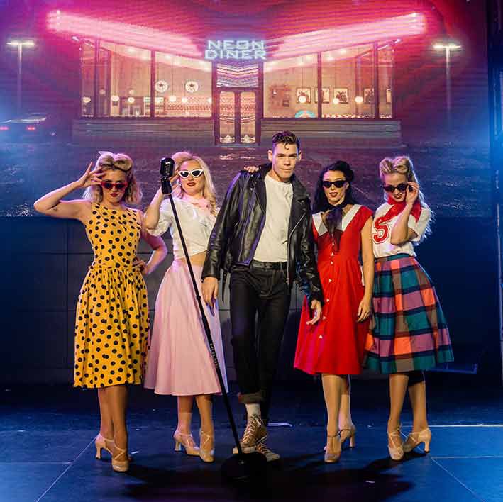 Transport your guests to the golden era of rock 'n' roll with our sensational 1950s-themed stage show, a blast from the past that will have every attendee twisting, jiving, and rocking to the rhythm of the jukebox hits!