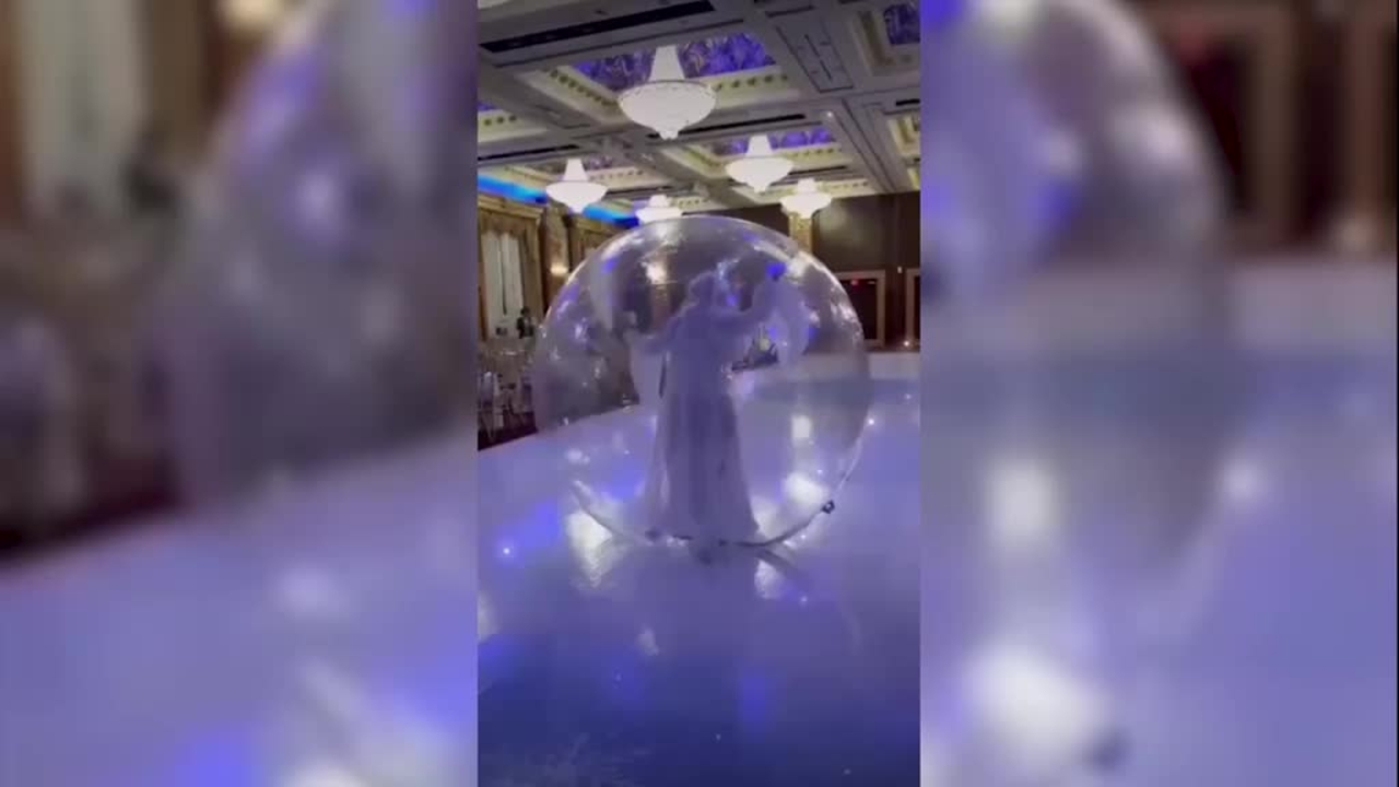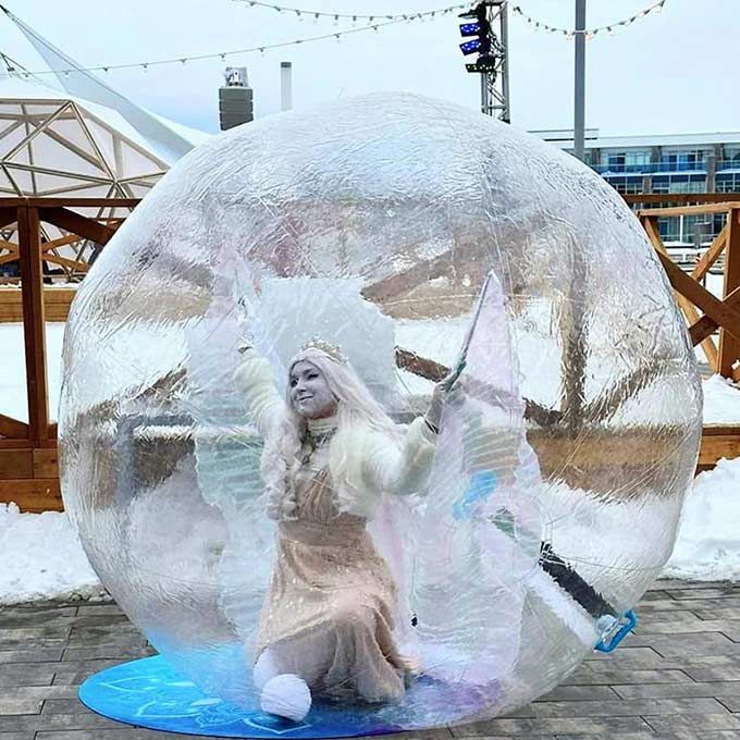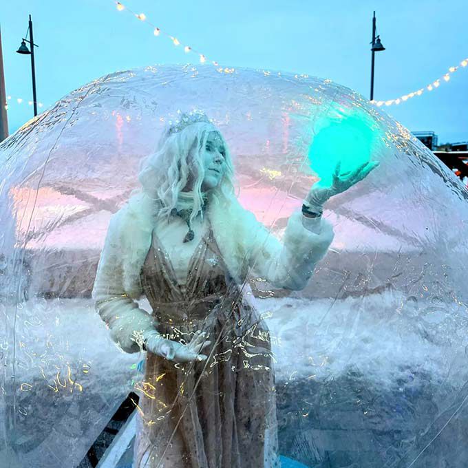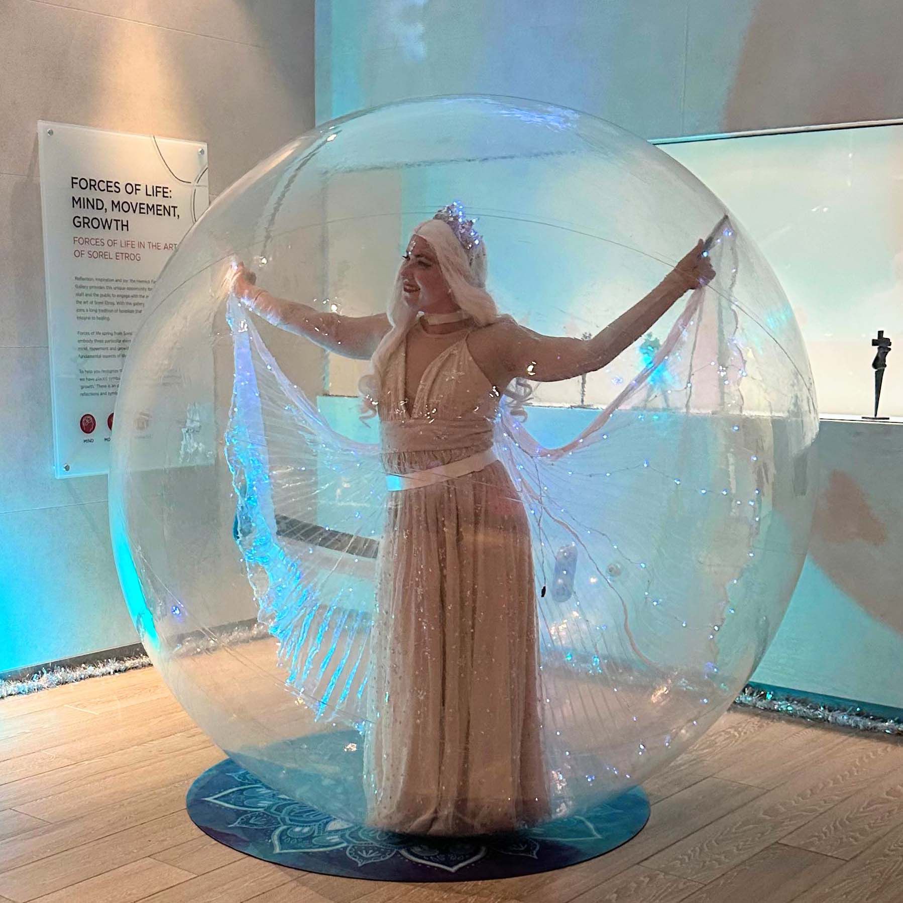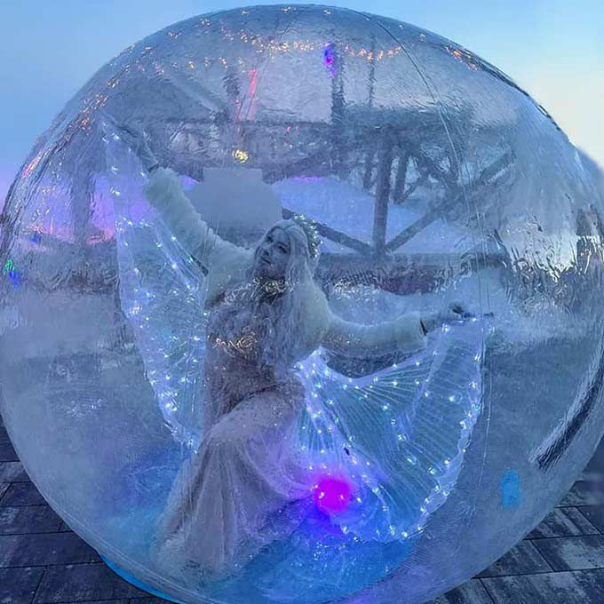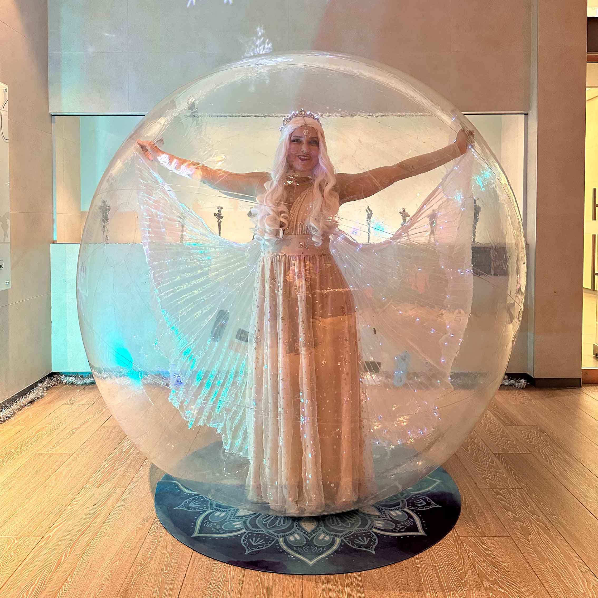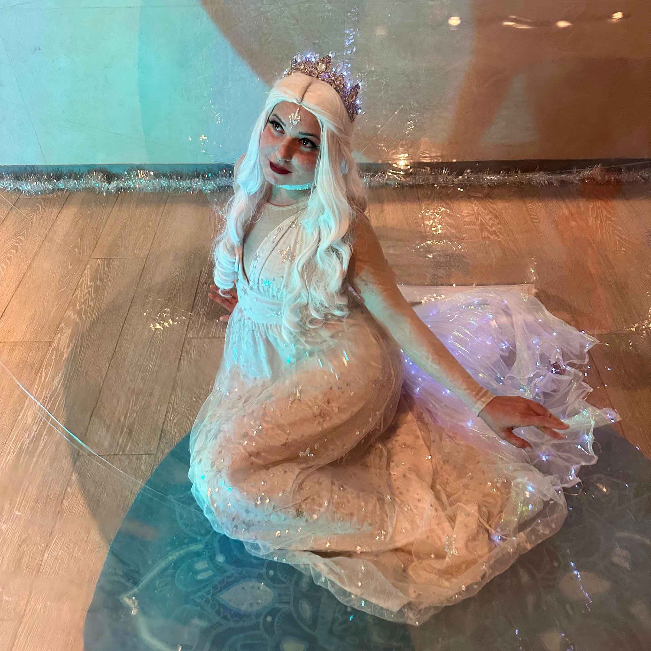 Our roaming ice queen contortionist performs inside a bubble, creating an enchanting atmosphere and impressive photo opportunities for your guests