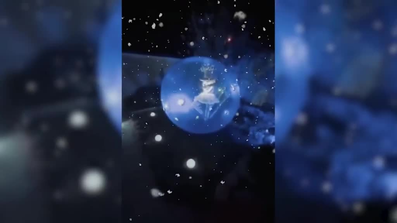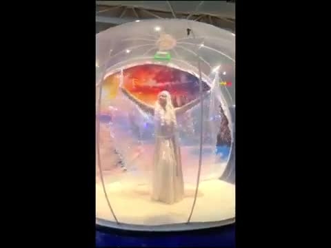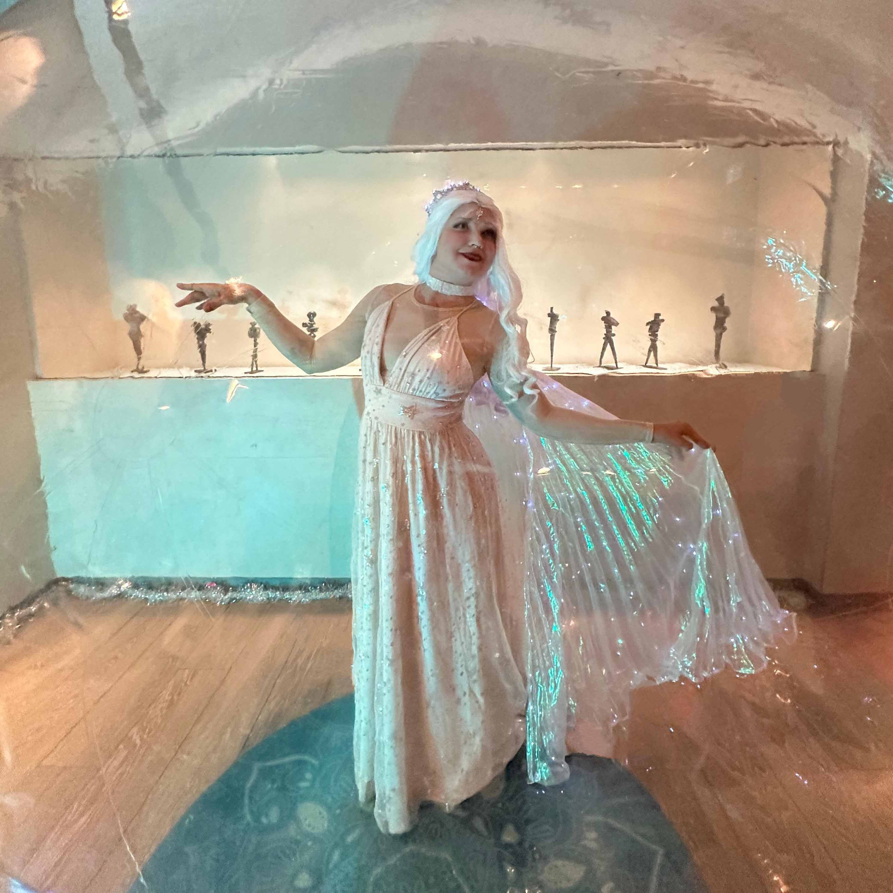An enchanted snow globe showcases the Ice Queen waving her LED Isis wings as she interacts with the crowd
