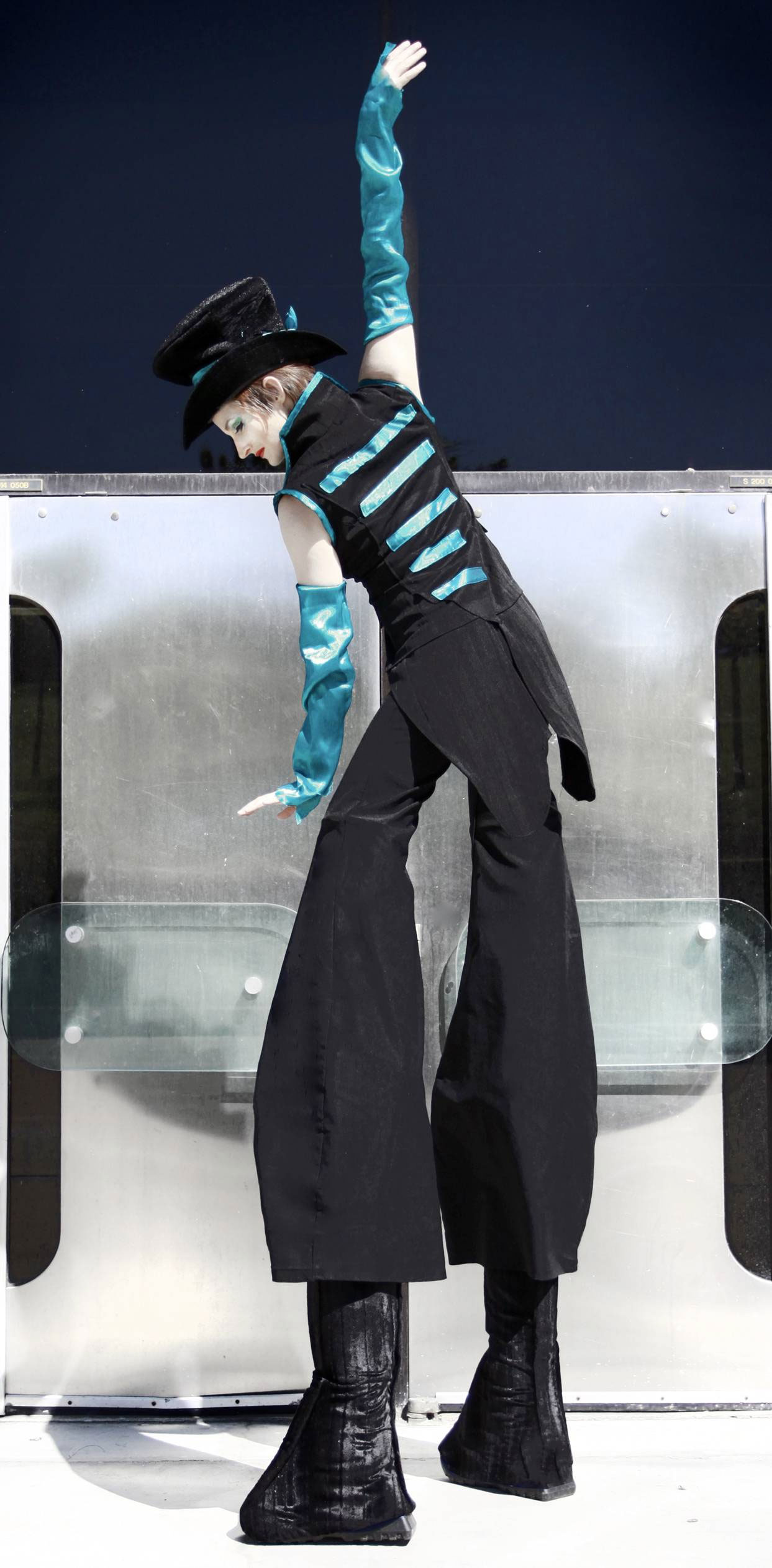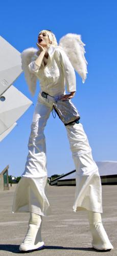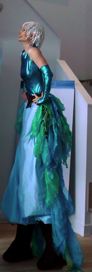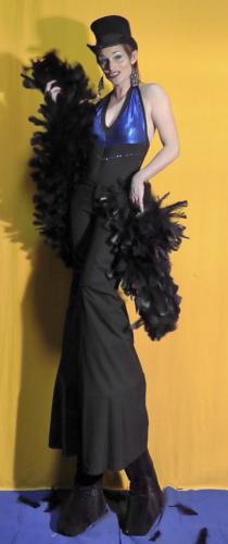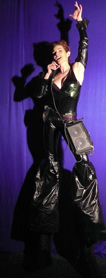 The Stilt Songstress is a series of high quality musical stilt characters designed to fit seamlessly into any event concept. Each version of the act combines costumed stilt-walking with live singing. Music and costume design range from black tie to children's festival. At it's most elegant, the act is performed on a wireless microphone system amplified through event PA system. Roving is available with most costumes with the option of a self-contained portable PA system integrated into the costume. The act works indoors and outdoors and needs a height clearance of only 8 feet.