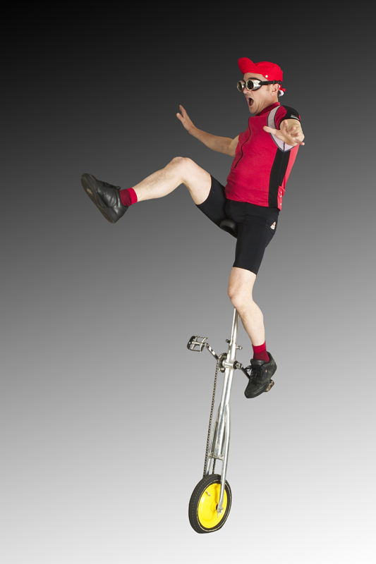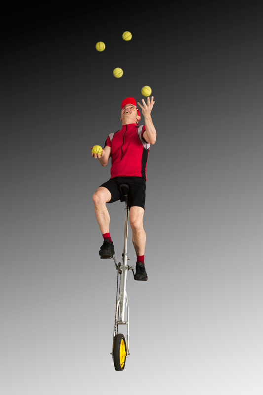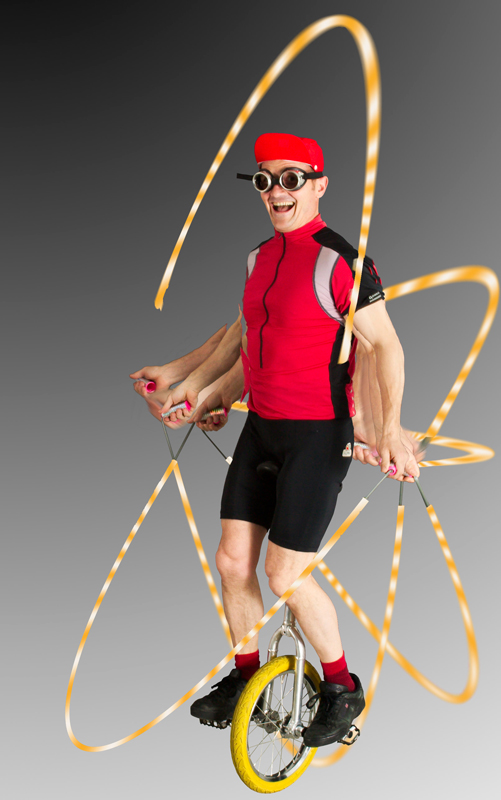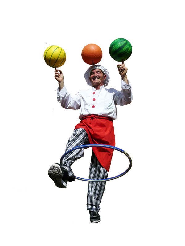A talented juggler and unicycle rider, our multiskilled circus performer can juggle different elements such as balls, pieces of fruit, pizzas or classic juggling clubs whilst riding his unicycle.