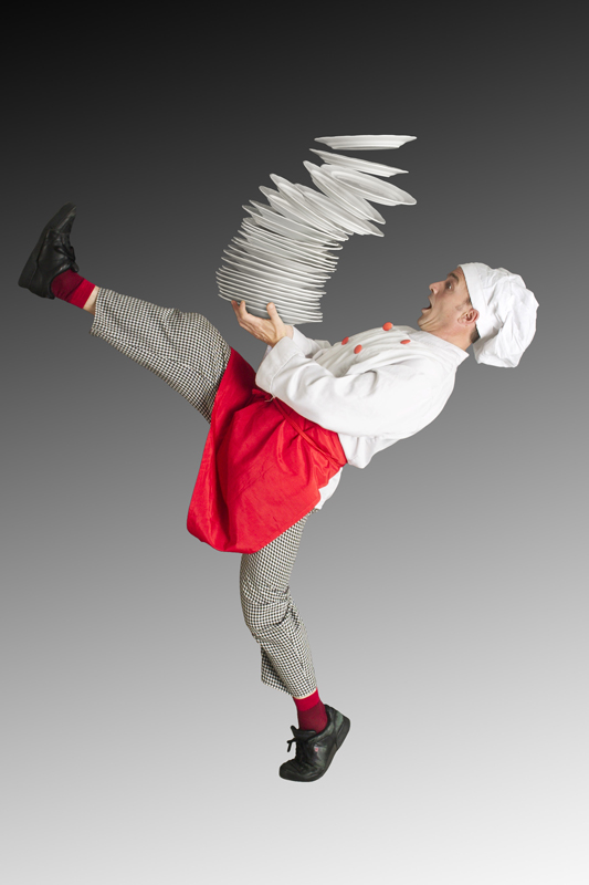 Our versatile artist’s circus variety show also includes quick-change acts. You can see some of the different costumes he can wear by checking the pictures above. He can transform into a clumsy chef at events and make everybody burst into laughter whilst he moves around clumsily and has problems staying balanced.