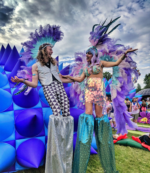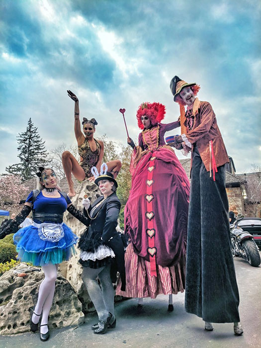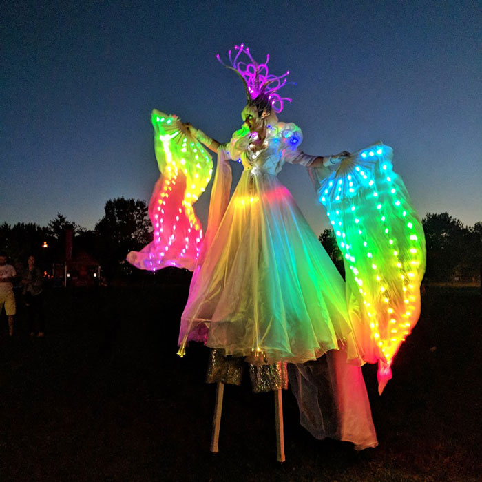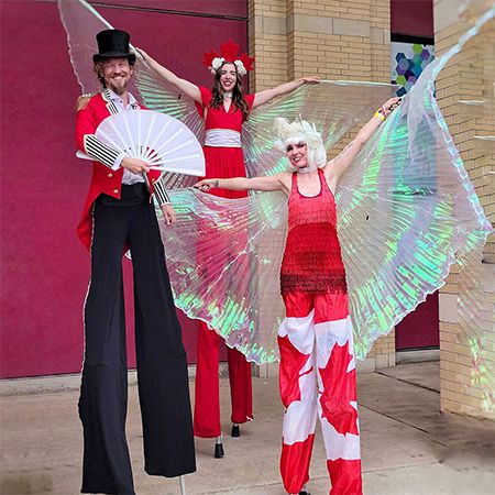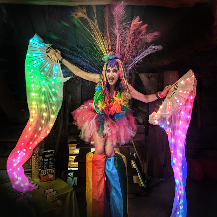 Offers a diverse selection of 50+ dynamic colourful stiltwalking characters
