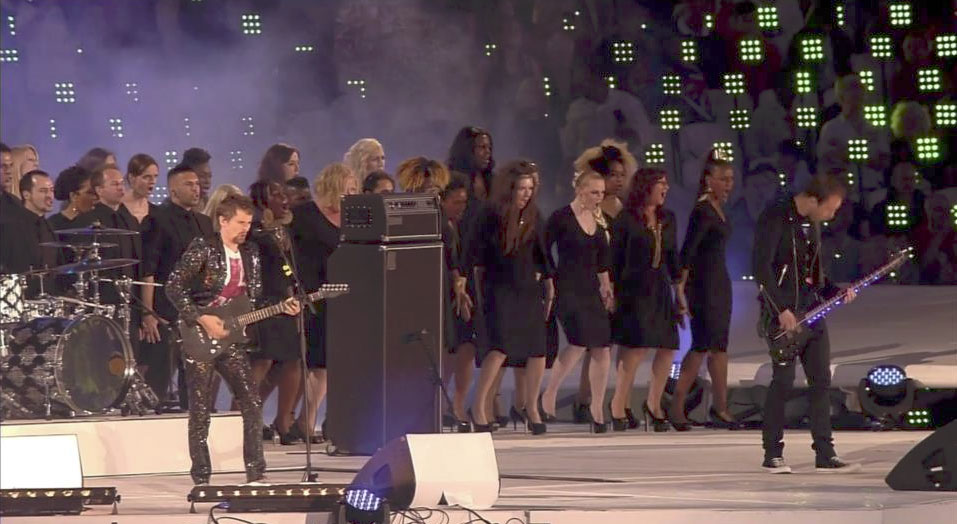 " "For all their efforts, the best singing of the night was choral - the gospel choir performing the National Anthem, and the combined London Welsh choirs who spiced up the Olympic anthem." "