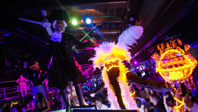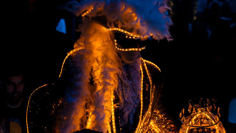 This LED gold performer is available to create beautiful spectacles featuring a variety of performers. Happy to share the limelight with other artists, this Venetian themed character regularly performs accompanied by LED ground characters, other stilt walkers and even themed musicians!