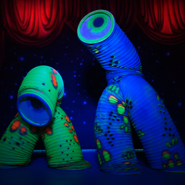 Our slinky act features two performers dressed in multi limbed slinky suits with giant eyes at each end, creating bizarre otherworldly monsters that dance and twist in impossible shapes. Guests will be enthralled by the amazing sight of our fantastic slinky dance and the wacky neon colours and shapes they make. For a totally unique dance show that promises to give audiences a taste of the unexpected, our human slinky dance show is the perfect choice.