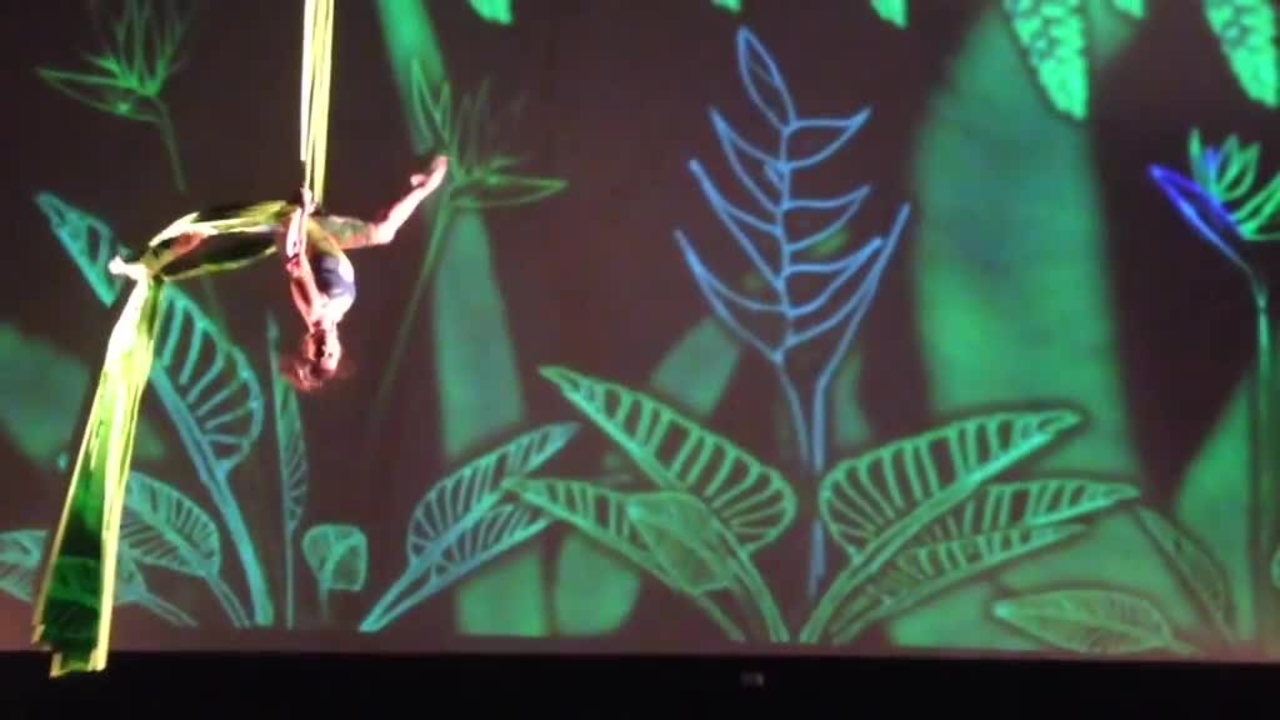 A stunning aerial dance routine that combines silk maneuvers and immersive video mapping