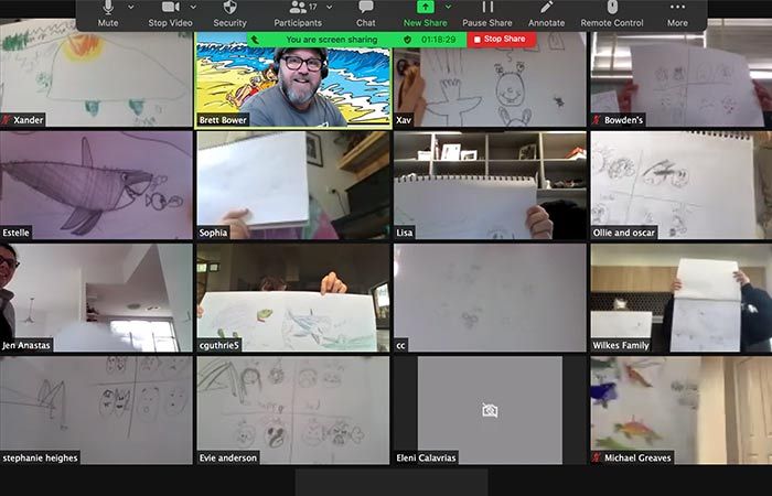 " Brett is a wonderful cartoonist and a gifted teacher. My six-year-old loves attending his Zoom drawing workshops. He is kind, calm, and patient with all those who attend and has really helped my daughter to improve her drawing skills. His classes are the highlight of her week. Thank you, Brett "