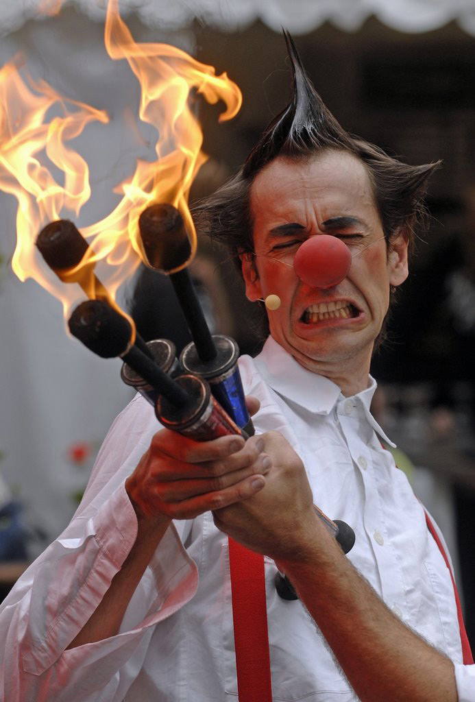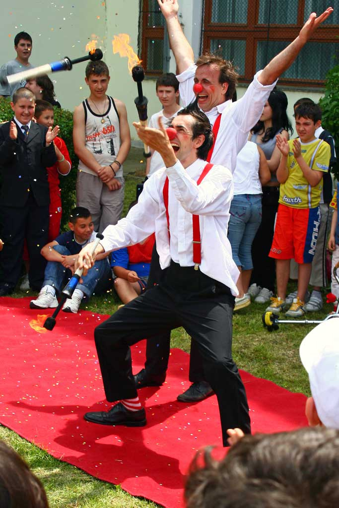 The two clowns take their sceptre in their hands and transform the stage into a theatre. Featuring amazing acrobatics, juggling and breathtaking fire eating, the comedy clowns provide laughing soreness guaranteed!