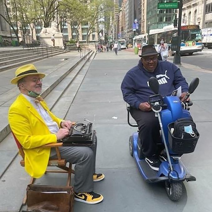 Dressed like an old-fashioned reporter in a fedora, yellow bow tie and yellow sport coat, this speedy writer will not go unnoticed at your event