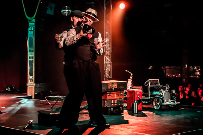 Unsere Comedy-Gangstershow der 1920er Jahre ist eine klassische Doppel-Comedy-Nummer mit Jonglage, Rolla Bolla und verschiedenen Comedy-Einlagen. Echte Glasflaschen und Gläser sowie Vintage-Koffer fliegen auf der Bühne herum, begleitet von Stepptanz und Live-Saxophon in einer umfassenden Kabarett-Stummfilm-Comedy-Nummer. Es gibt nie einen langweiligen Moment und Ihre Gäste werden mit einem breiten Lächeln auf dem Gesicht zurückbleiben.