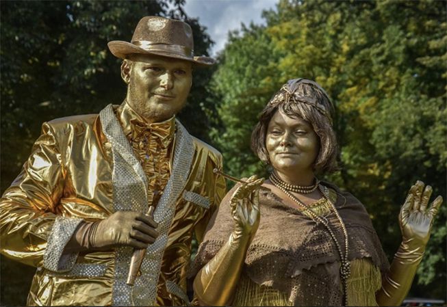 Bereiten Sie sich darauf vor, mit diesen goldenen lebenden Statuen im Stil der 1920er Jahre in eine andere Zeit versetzt zu werden, gekleidet in einen schicken Anzug und ein Flapper-Kleid.