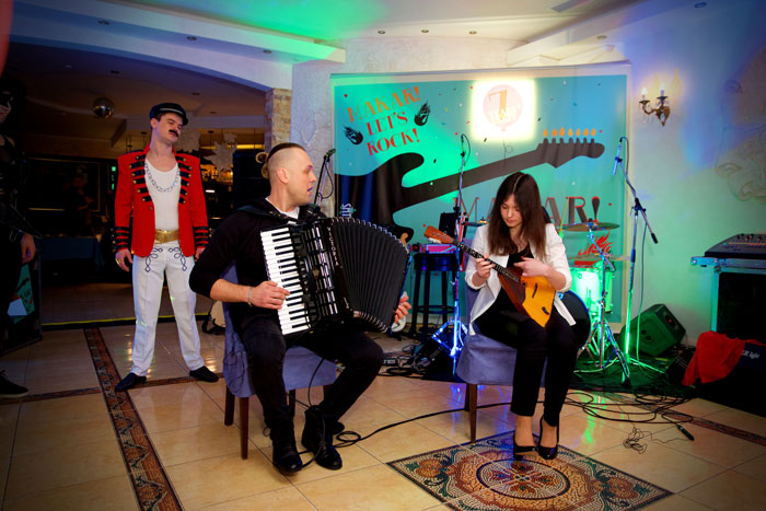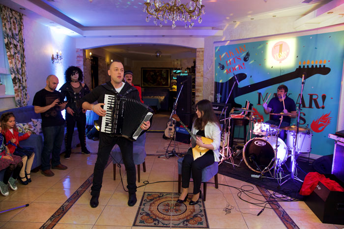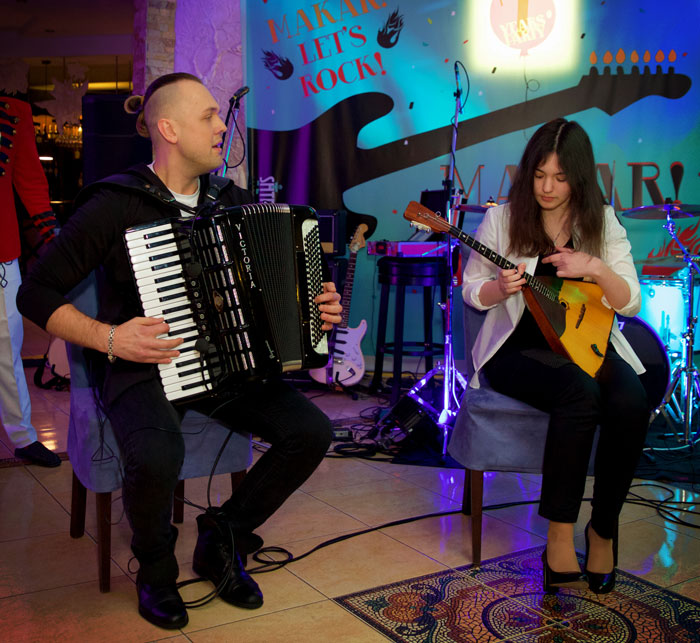 Die Akkordeon-geführte Partyband ist ein Trio, das aus Schlagzeug, Balalaika und Akkordeon besteht. Alle drei sind akustische Instrumente, die potenziell mit Verstärkung spielen könnten, jedoch wird ein PA-System für maximale Wirkung empfohlen. Die ungewöhnliche Partyband kann bis zu anderthalb Stunden Live-Musik bieten und passt die Cover-Songs an die Vorlieben des Kunden an.
