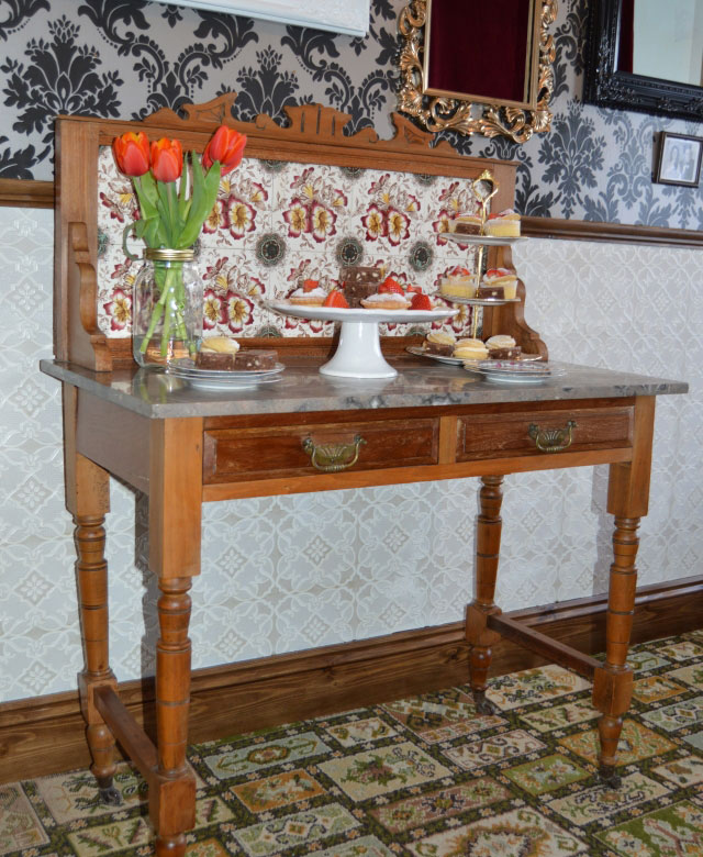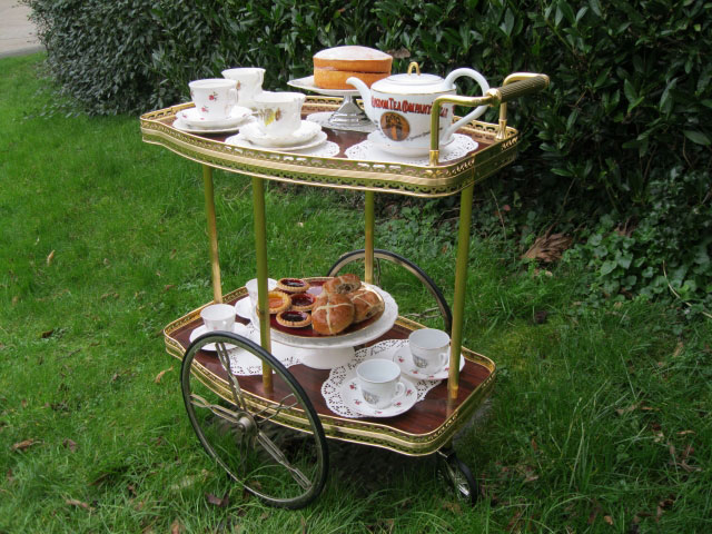 - Kuchentische und -ständer, Kuchenschilder und thematische Teekannen, Vintage-Tee-Servierwagen