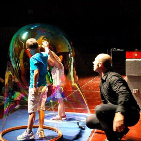 Schauen Sie zu, wie einfache Seifenblasen in atemberaubende Skulpturen verwandelt werden, während unser Seifenblasen-Magier Rauch in einer Blase einschließt, Blasen in Form von Würfeln formt und sogar mutige Zuschauer in eine Riesenblase steckt!