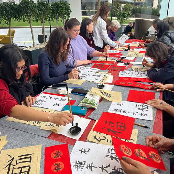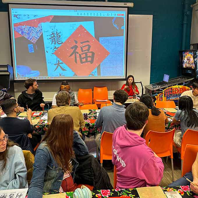 Wählen Sie aus einer Vielzahl von Themen, darunter chinesische Kalligraphie, CNY chinesische Paarreime und ein Workshop, der sich auf die Erstellung eigener Kunstwerke konzentriert.