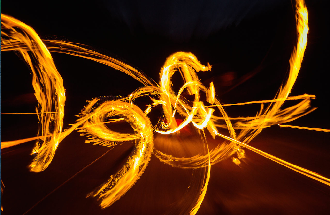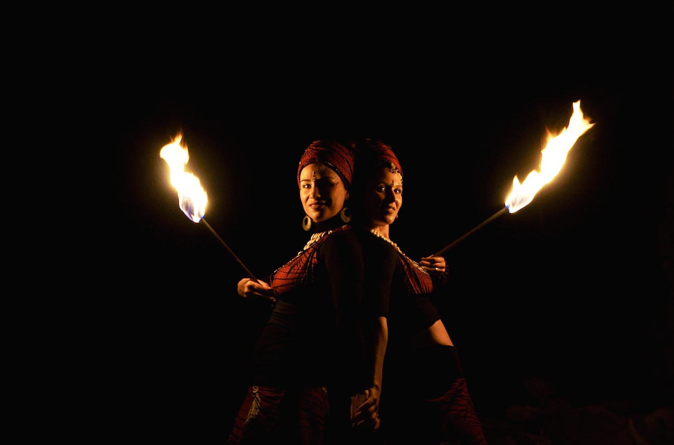 Die choreografierte Feuertanzshow ist eine einzigartige Kunst, die Tanz, die nordindische Kunst des Banethi, Akrobatik, verschiedene Techniken von Feuerrequisiten, die oft in Kampfkünsten verwurzelt sind, und die dynamische Schönheit von Feuerkreisen im Kontrast von Licht und Dunkelheit kombiniert.