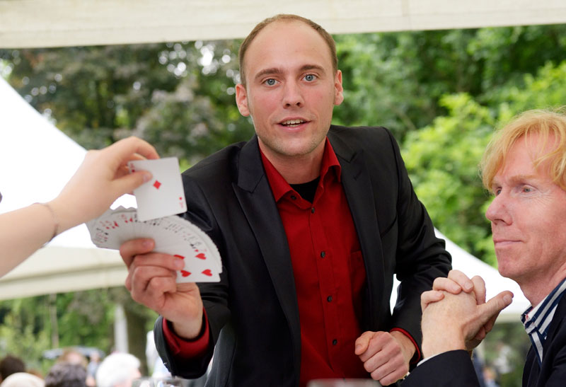 Einige der beliebtesten Tricks dieses talentierten Unterhaltungskünstlers sind Close-Up-Magie mit Karten. Er lässt die Zuschauer immer wieder ungläubig die Augen reiben, wenn er 10 Euro in 50 Euro Banknoten verwandelt und Objekte direkt vor ihren Augen verschwinden lässt!