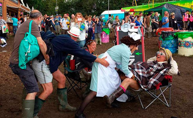 " Mix and Mingle Comedy Nurses brachten wunderbares Chaos (und den Geburtsplan, den Ihr Ehemann nicht kannte, den er brauchte) auf die Theater- und Zirkusfelder des Glastonbury Festivals. "