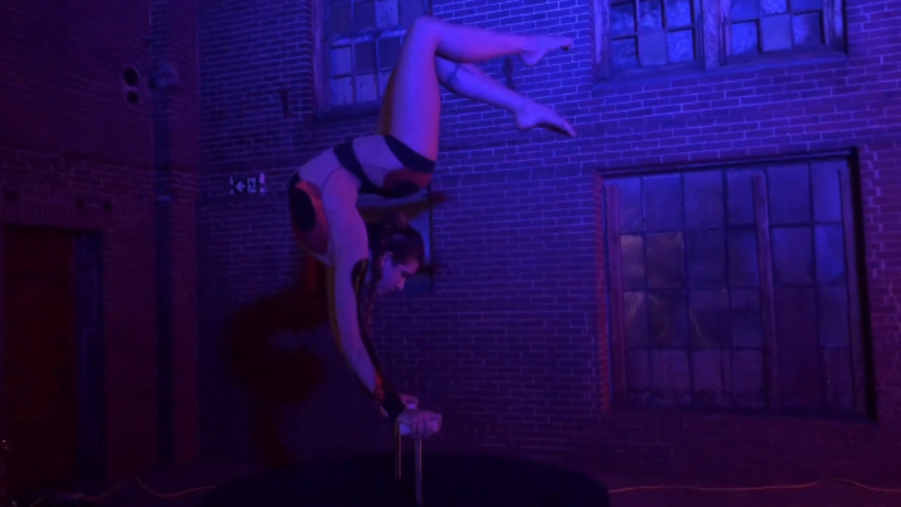Unsere Zirkusartistin ist auf Verrenkungen und Handstand spezialisiert und präsentiert in ihren Darbietungen ihre extreme Flexibilität, Stärke und Anmut.