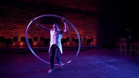 Seine Darbietungen zeigen Stärke, Anmut und Geschicklichkeit, während er über die Bühne wirbelt, auf einem 6ft Stahlring; diese dynamischen Shows begeistern das Publikum.