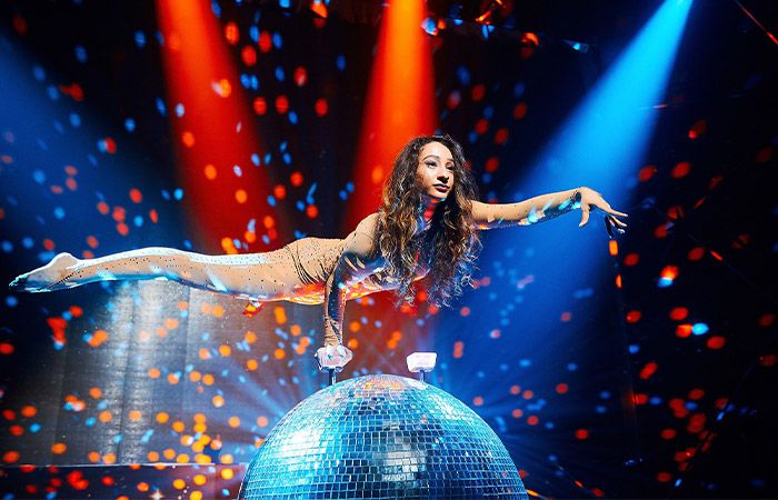 Bemerkenswerter Hand-Balance-Akrobat führt atemberaubende Darbietungen auf verschiedenen Requisiten wie einem glitzernden Diamanten und Discokugeln auf.