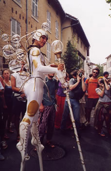 Die Champagner-Dame und ihr Partner werden Ihre Gäste begrüßen und ihnen auf originelle und einzigartige Weise Champagner servieren. Die futuristische Stelzenfigur mit Gehweg hält einen mit Champagner gefüllten Tank auf ihrem Rücken, während sie ihn an die Gäste verteilt.
