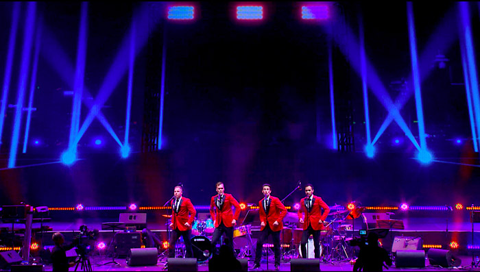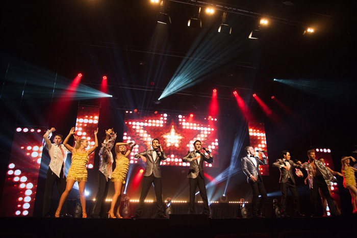 Dies ist eine vollständig choreografierte Gesangs- und Tanzshow mit perfektem Live-Gesang, schicken Anzügen und stilvollen Künstlern.