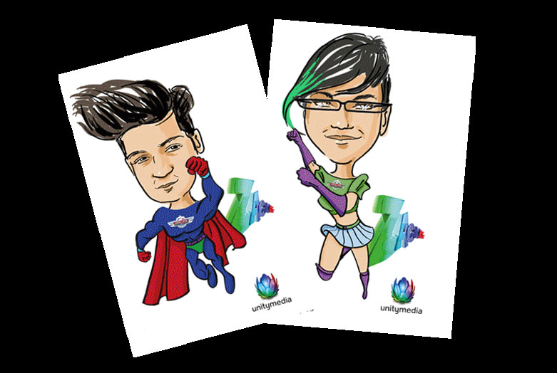 Besonders geeignet für Werbeveranstaltungen und Ausstellungen kann unser Event-Digitalillustrator jede Karikatur mit Ihrem Marken- oder Veranstaltungslogo personalisieren. Wenn er vor Ort arbeitet, stellt unser digitaler Karikaturist sicher, dass er seine Zeichnungen in weniger als zehn Minuten erstellt, um so vielen Menschen wie möglich die Möglichkeit zu geben, mit seinem digitalen Pinsel verewigt zu werden.