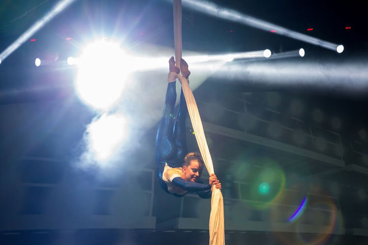 Faszinierende Dubai-Seidenakrobatin nimmt das Publikum mit auf eine Reise, während sie hoch in der Luft tanzt