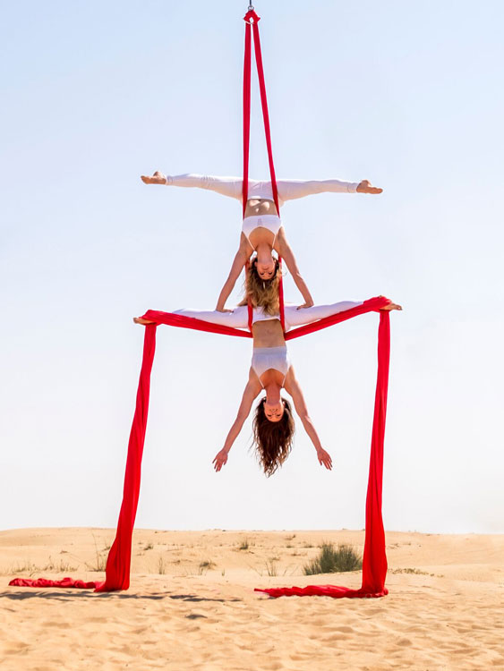 Neben fesselnden Soloauftritten kann unsere Seidenakrobatin auch als Duo gebucht werden. Als beeindruckendes Highlight bei jeder Veranstaltung bewegen sich unsere Seidenakrobatik-Duos wie eine Einheit, verschlingen sich und vollbringen unglaubliche Kraft-, Balance- und Eleganzleistungen.